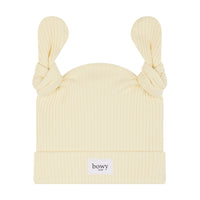 Newborn baby in a yellow-coloured outfit with double knot beanie on a white blanket