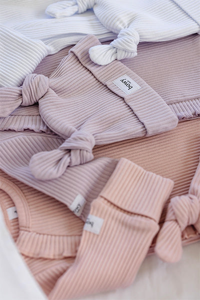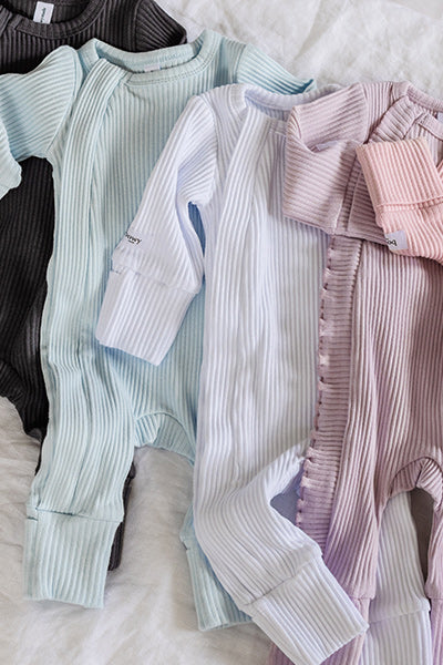We use our premium ribbed cotton throughout a range of our onesies and headwear. With a slightly heavier feel than SoftLuv™, our ribbed cotton ensures your little one is always deliciously comfortable and cosy.