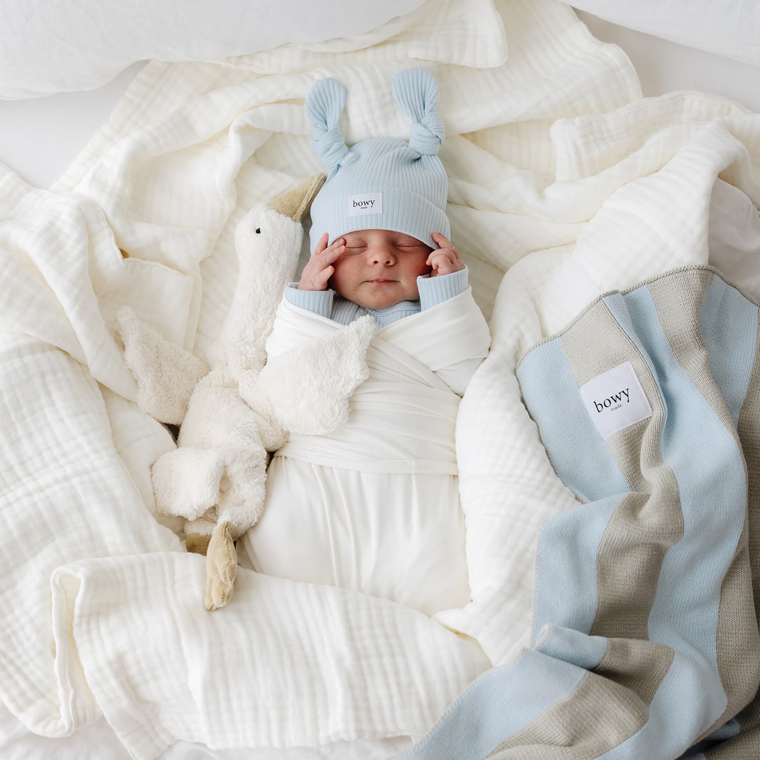 Made from 100% soft, luxurious cotton. The Bowy Made Knit Blanket is plush, breathable and loving gentle against skin. Designed to be comfortable year-round. Measuring a generous 1m x 1m, this blanket will become a keepsake from birth.