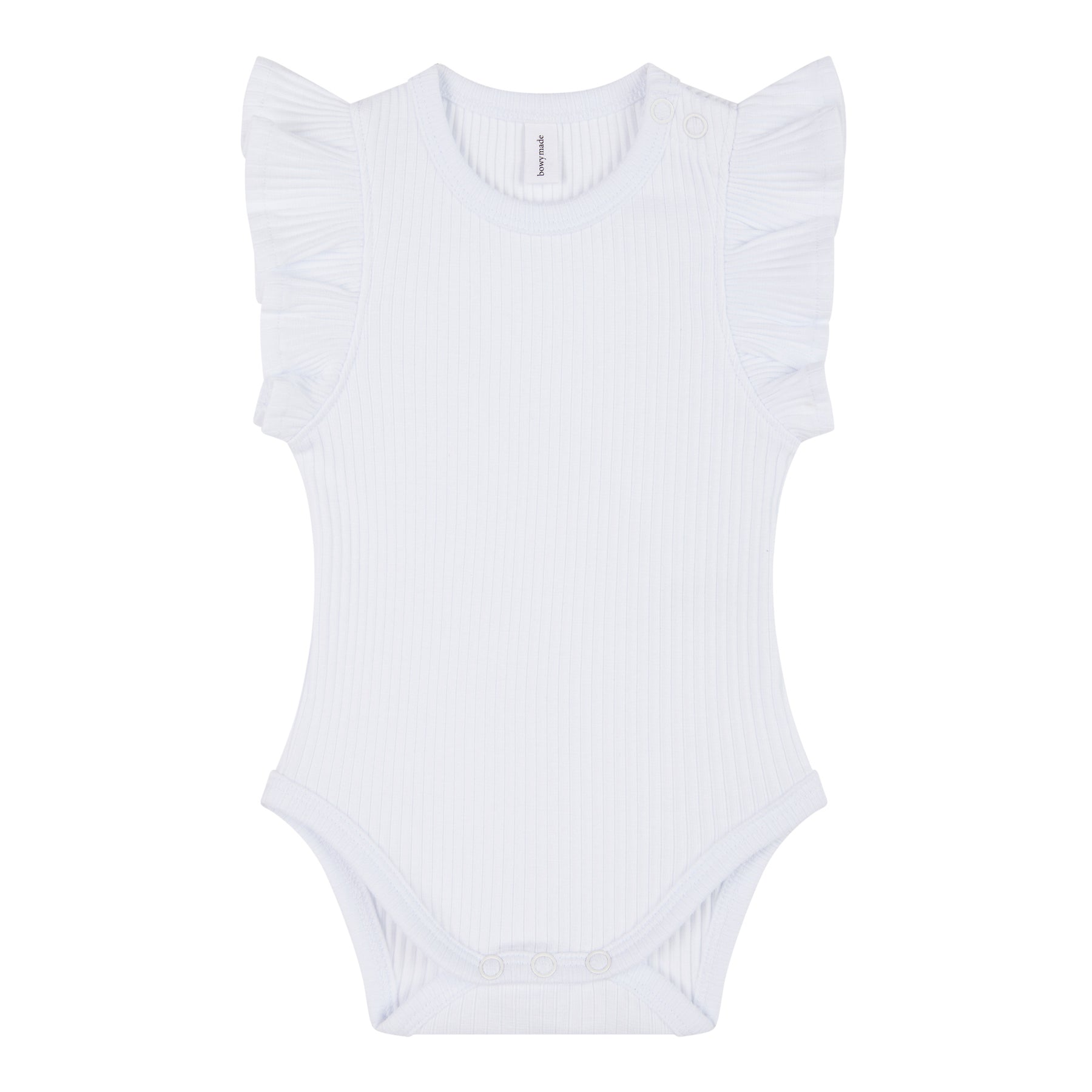 Our White Summer Frill Onesie is a timeless essential made from soft, breathable ribbed cotton. Designed for comfort and style, it features delicate frill details on the shoulders and convenient press-stud clasps for easy changing. Perfect for warm days, this sweet piece keeps your little one cool, comfy, and effortlessly adorable.