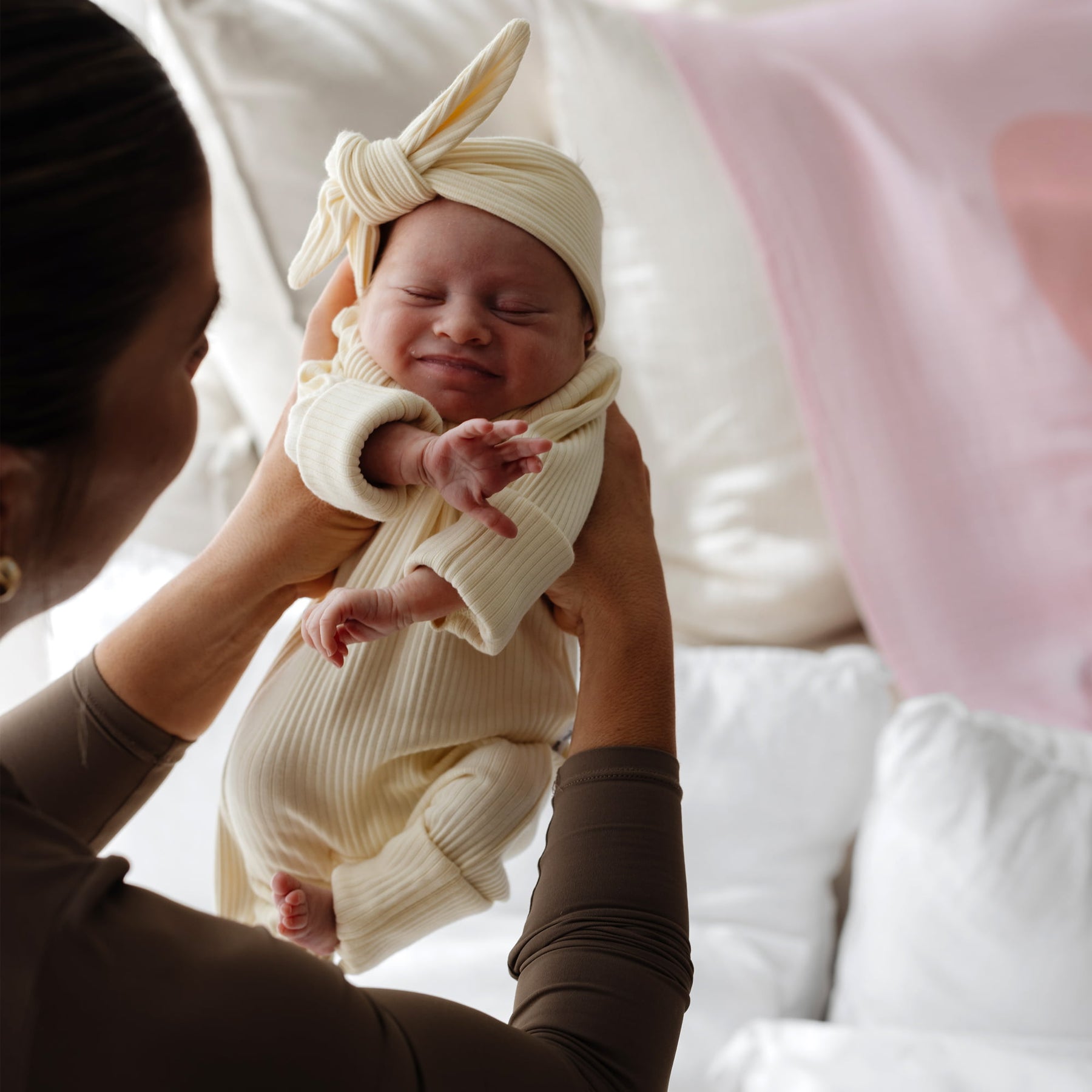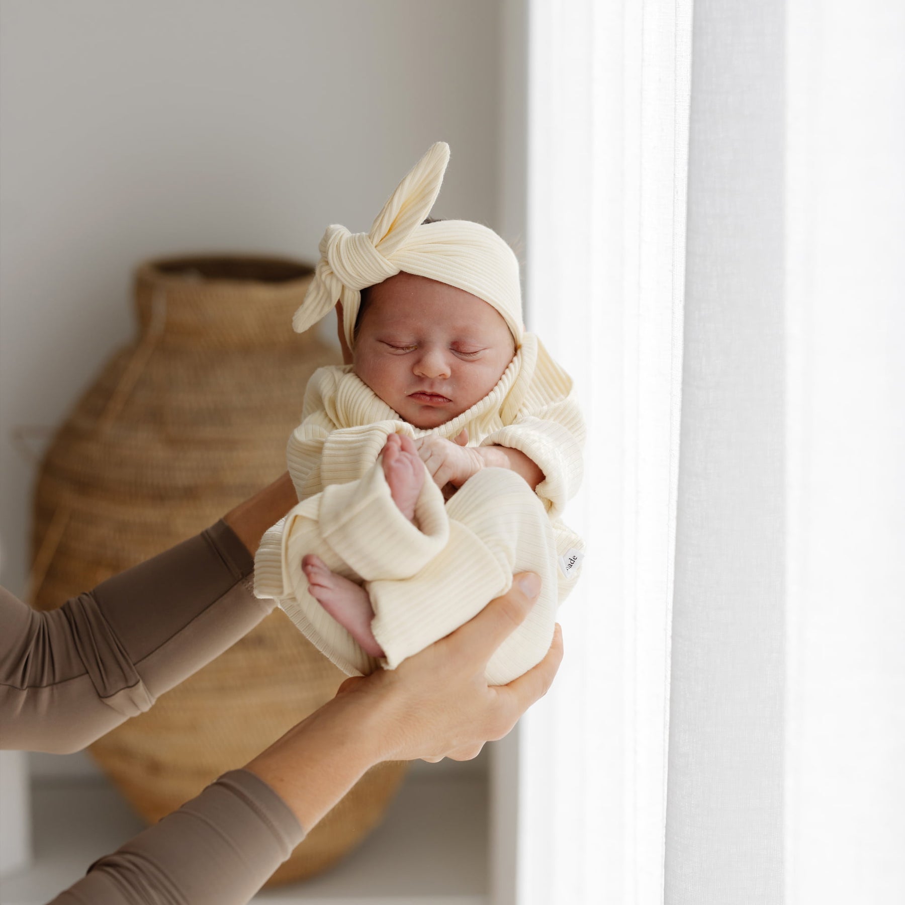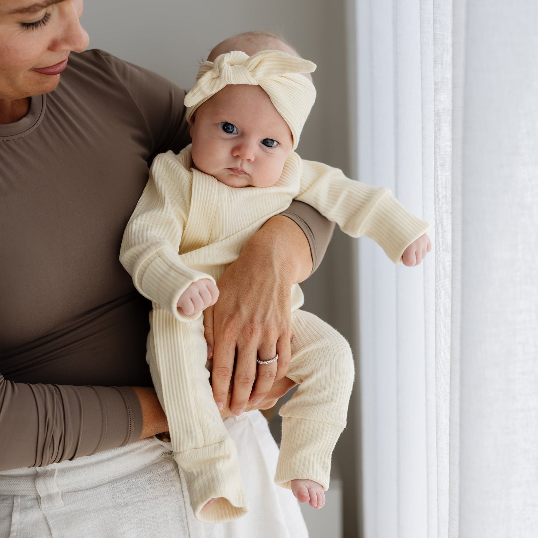 Designed with luxe style and practicality in mind, our ribbed headbands perfectly complement our Bowy Made onesies. Comfortable to wear and made to stay on, our headbands are crafted from a premium ribbed fabric that is dreamily soft with our signature stretch. And mamas, you can tie the headband any way you like!