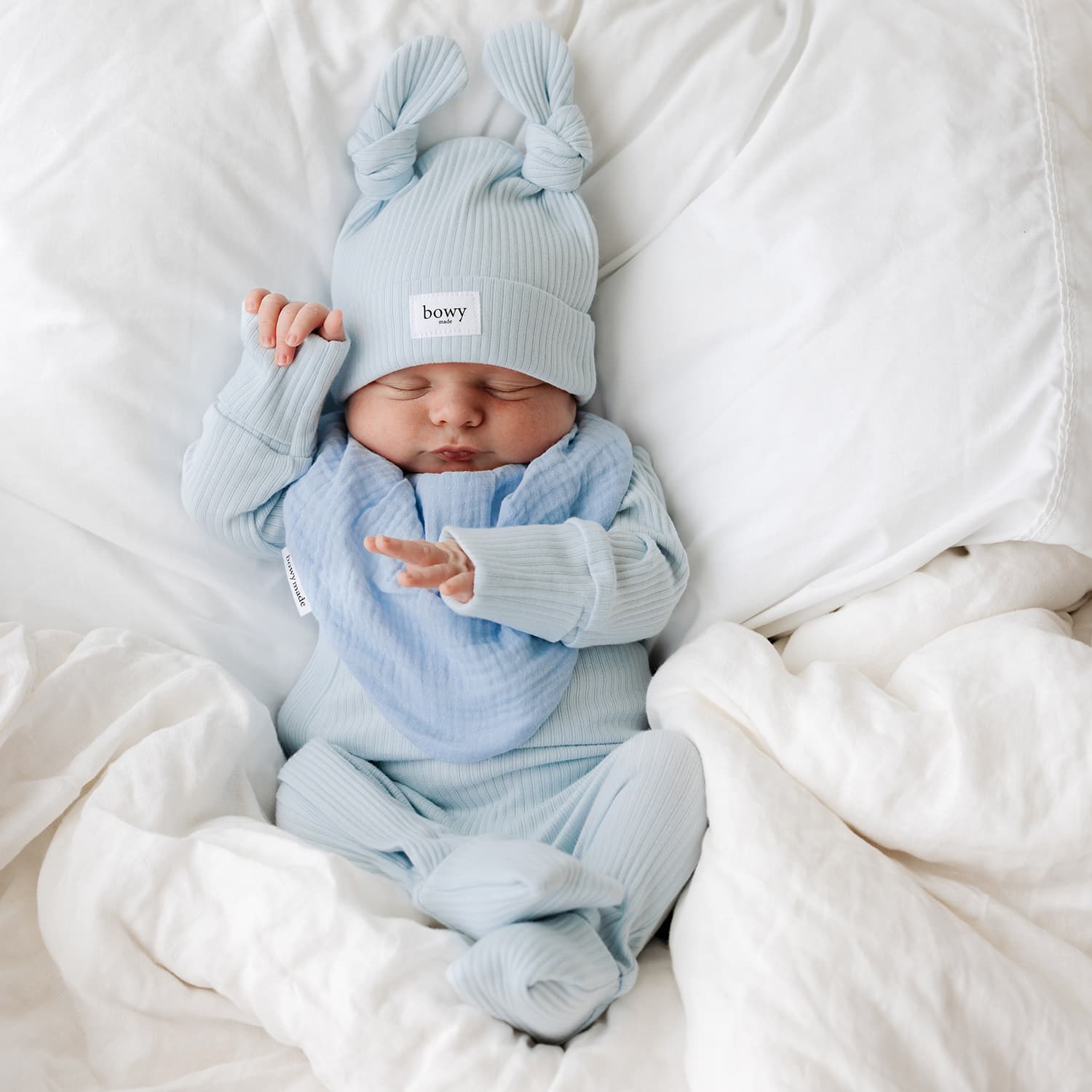 Baby wearing all blue matching outfit that include double knot beanie and muslin cotton dribble bib.