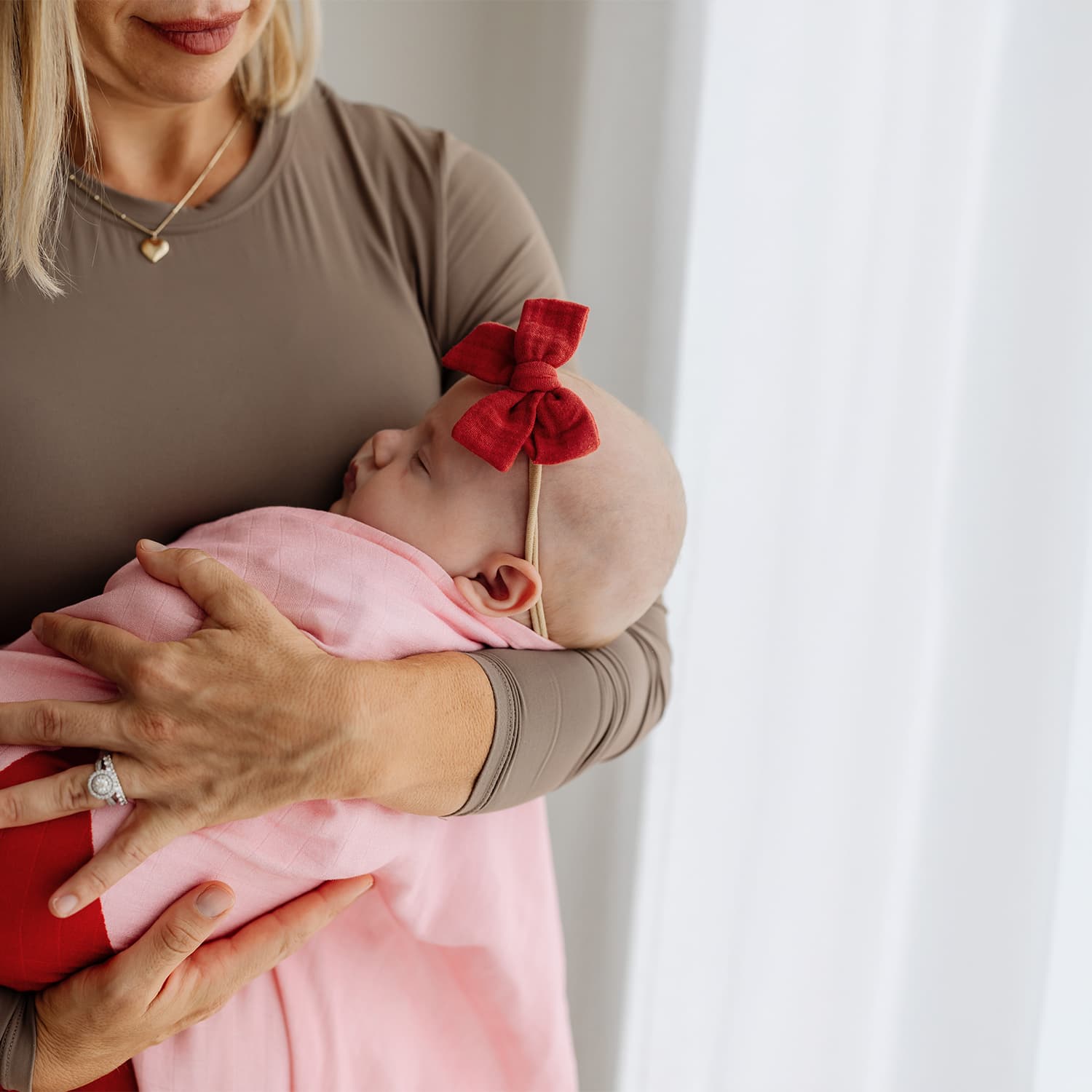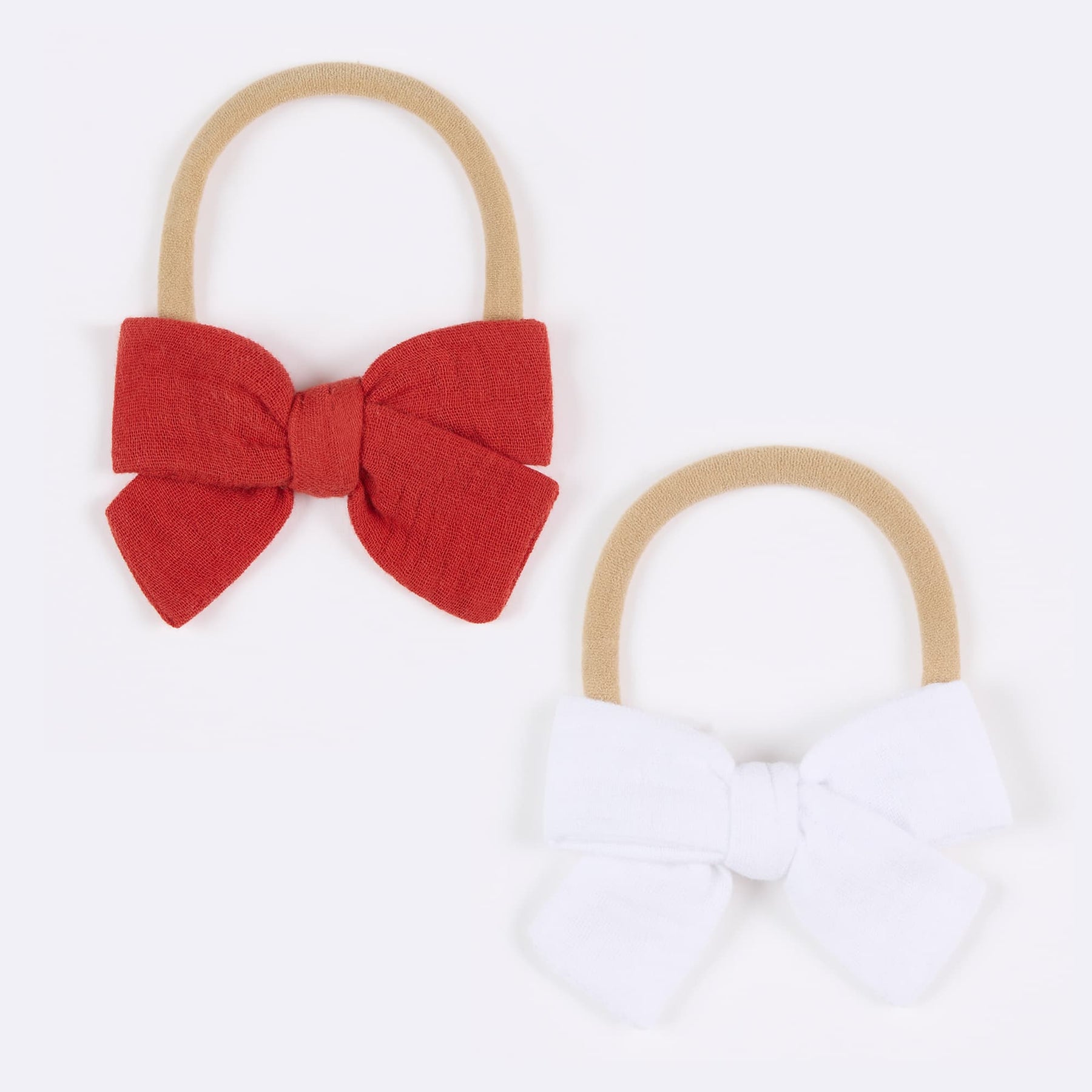 Complete your little one’s look with our baby bow headbands in Red and White. This 2-piece set is designed to add a timeless, statement finish to any outfit. Each bow is crafted from soft muslin cotton and secured to a gentle, stretchy stocking band for a comfortable, flexible fit.